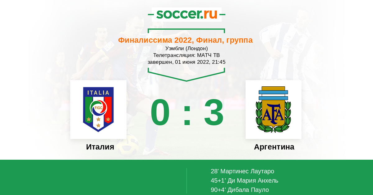 В этом матче под названием Финалисима. Будем наблюдать встречу между Италия - Аргентина. Встретиться лучше команда южной Америки - Аргентина, против лучше команды Европы - Италии. После не выхода сборной Италии в чемпионат мира, им есть что доказать. Аргентина легко прошла в ЧМ, да и по личным встречам пока у Аргентины существенный перевес. Так что будем ждать результативной игры от команд в этой игре. Удачи