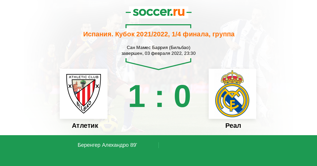 Единственная проблема для "Атлетика" состоит в том, что в четвертьфинале ему будет противостоять мадридский "Реал", которому баски уже трижды проигрывали по ходу текущего сезона и семь раз в последних десяти встречах.
