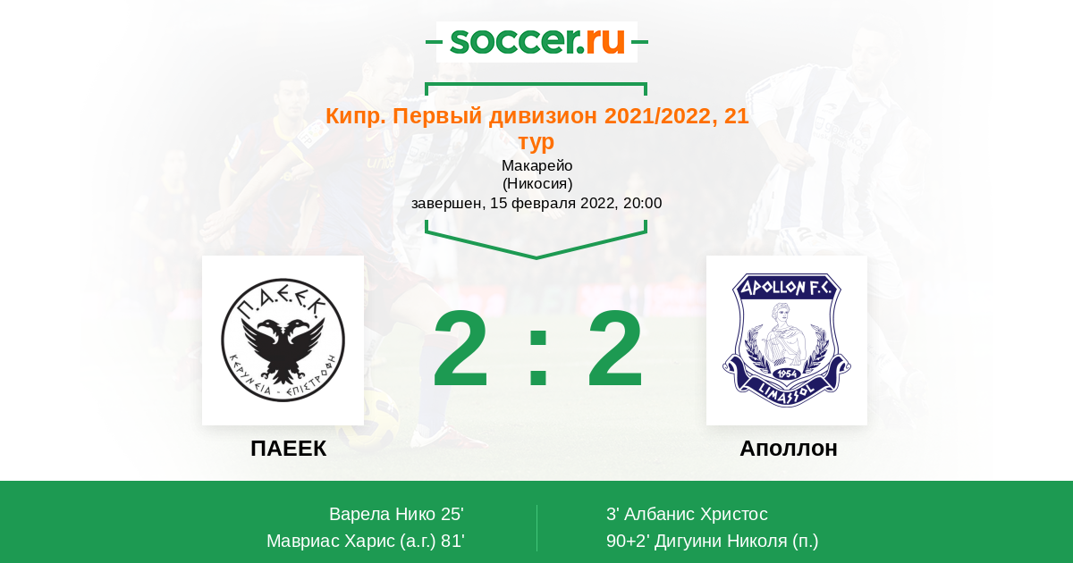 Запасные: 14 Эно Льюис (с 62'), 17 Бабич Матко (с 62'), 8 Энрике Фернандо (с 76'), 10 Хараламбус Маркос (с 76'), 1 Панайоту Панайотис, 16 Аристотелус Хараламбос, 18 Комодикис Андреас, 19 Неофитоу Андреас, 25 Тиммерманс Тийс, 98 Неофуту Андреас, 99 Мавромустакос Константинос, 20 Капартис Хрисовалантис