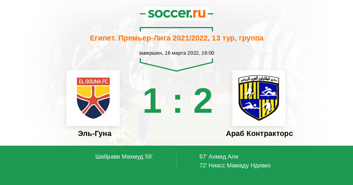 59' (1:0) Шабрави Махмуд (7) (Эль-Саед Нур (14))