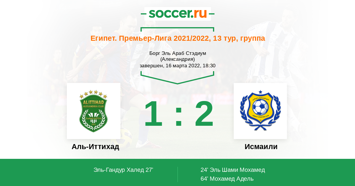 27' (1:1) Эль-Гандур Халед (10) (Адель Ахмед (14))