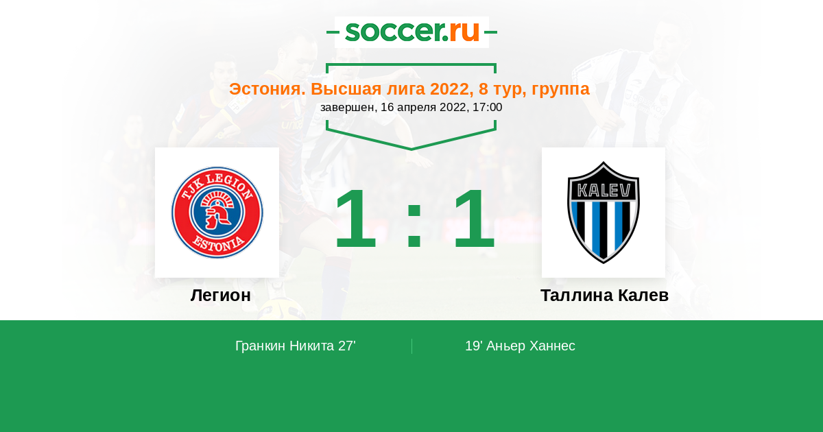 Запасные: 13 Силлама Рамол (с 46'), 4 Лаур Каспар (с 60'), 12 Пурье Атс (с 69'), 7 Реймаа Рейхард (с 76'), 3 Бергман Александр, 5 Панк Георг, 15 Смирнов Рамон, 37 Лилл Карл, 71 Аун Рудольф