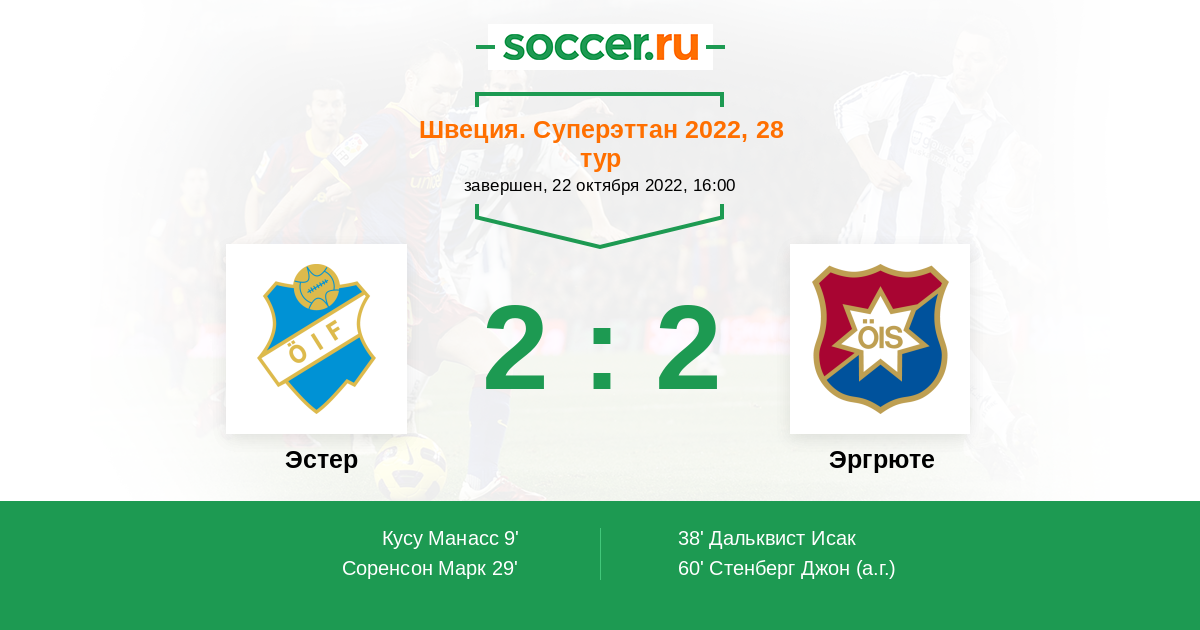 38' (2:1) Дальквист Исак (17) (Садику Эрион (28))