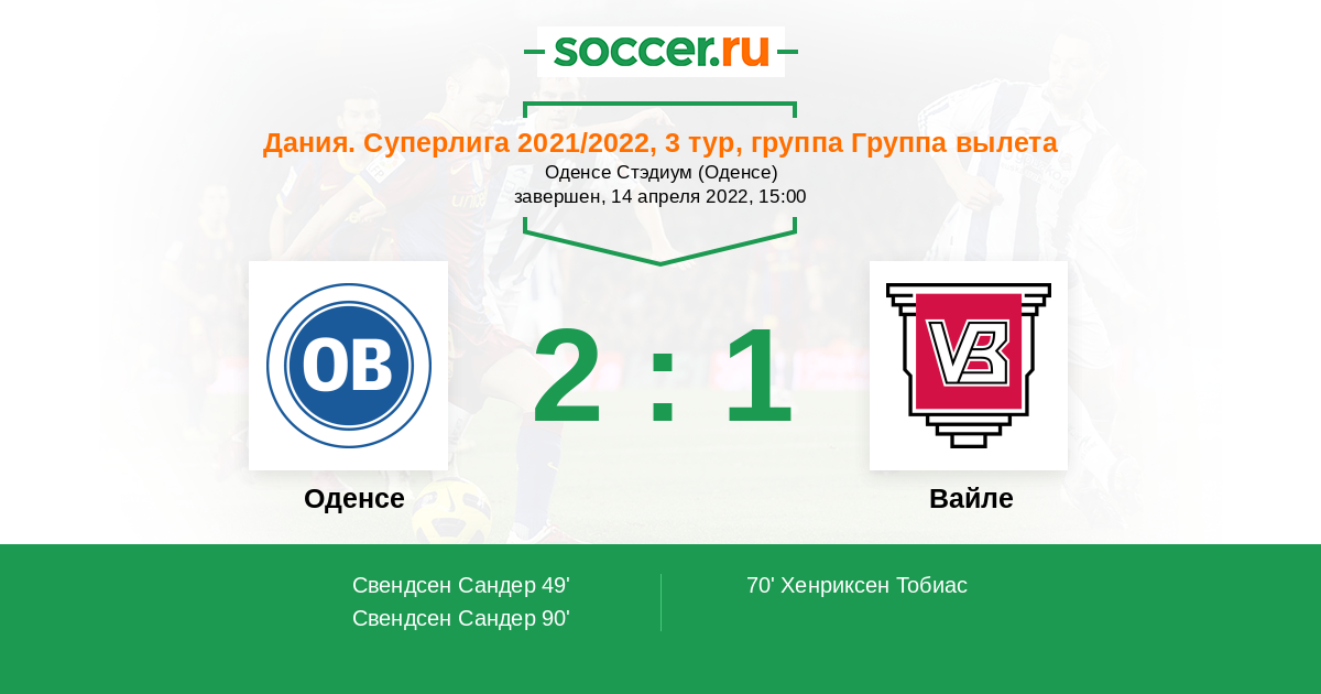 49' (1:0) Свендсен Сандер (10) (Троелс Клове (23))