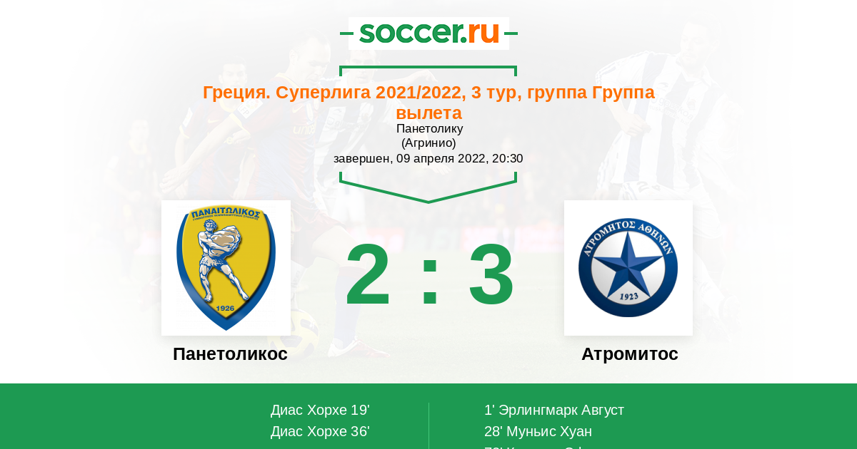 72' (2:3) Кулурис Эфтимиос (20) (Эрлингмарк Август (17))