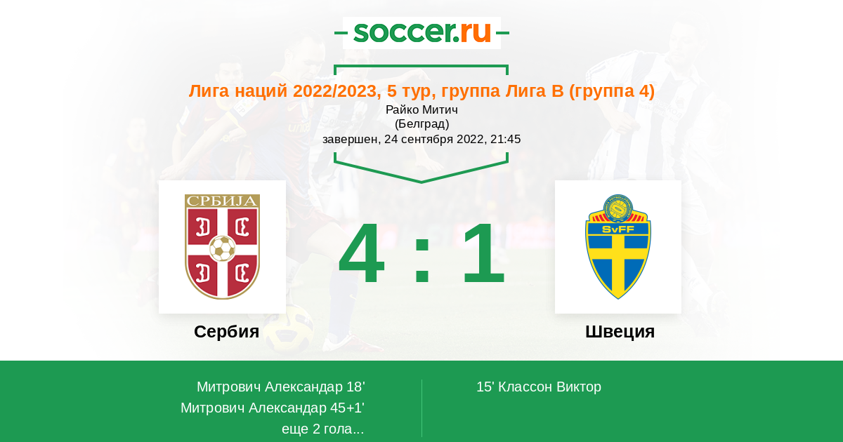 Запасные: 1 Дмитрович Марко, 12 Илич Марко, 2 Павлович Страхинья, 5 Эракович Страхиня, 22 Лазович Дарко (с 46'), 3 Младенович Филип, 7 Радоньич Неманья, 8 Рачич Урош (с 72'), 19 Илич Иван (с 84'), 21 Джуричич Филип, 15 Митрович Стефан (с 84'), 11 Йович Лука (с 90')