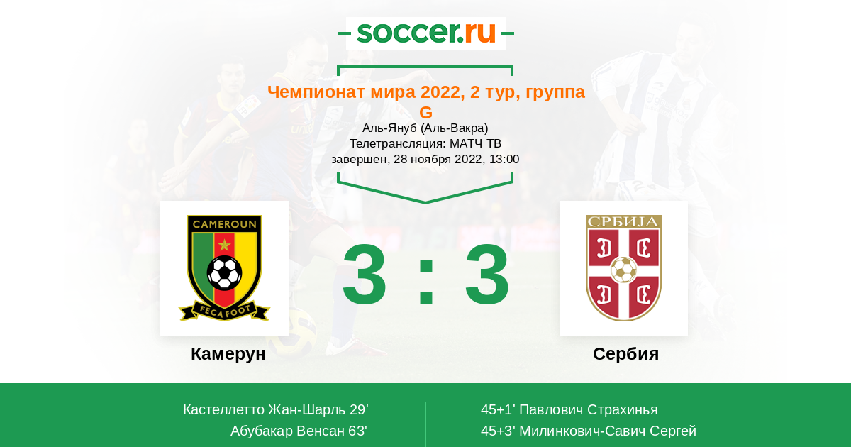 Сербия, ослабленная травмами нескольких своих лидеров, не смогла абсолютно ничего противопоставить сборной Бразилии в атаке. Как сказал сам тренер сербов, возможно его команда проявила излишнее уважение к оппоненту — очень похоже на то. В игре с Камеруном ожидается куда большая активность балканцев в атаке. Не в последнюю очередь это связано и с Влаховичем, который возможно выйдет уже в стартовом составе. Другой вопрос, насколько он и его партнеры по атаке Костич и Митрович готовы биться на максимуме. Все-таки вся эта тройка еще не восстановилась до конца.