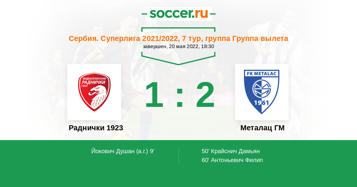 9' (1:0) Автогол Йокович Душан (4)