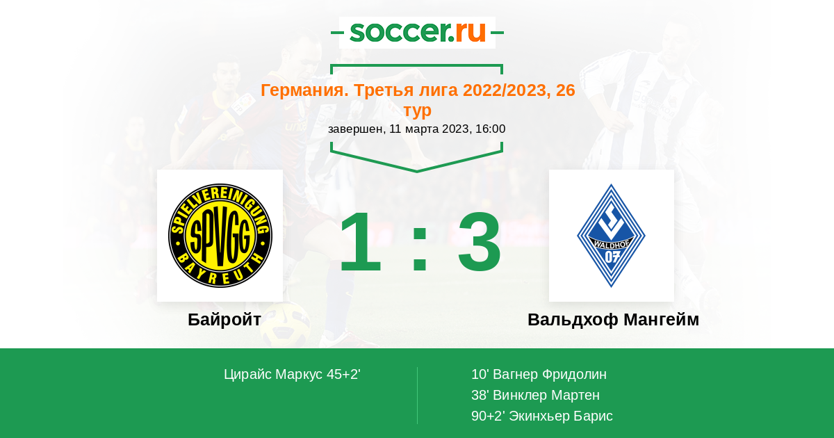 45+2' (1:2) Цирайс Маркус (11) (Кирш Бенедикт (6))