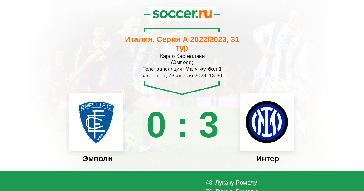48' (0:1) Лукаку Ромелу (90) (Брозович Марцело (77))