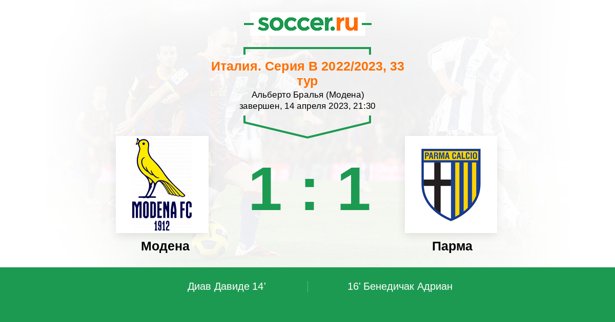 14' (1:0) Диав Давиде (99) (Тремолада Лука (10))
