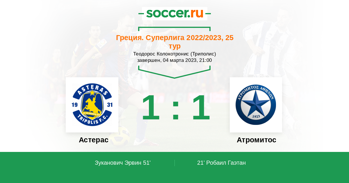 Запасные: 17 Эрлингмарк Август (с 67'), 9 Цавидас Мариос (с 74'), 20 Клонаридис Виктор (с 74'), 8 Фридйонссон Самуэль (с 75'), 24 Мавроматис Теофанис, 99 Цорвас Гиоргос, 88 Оикономидис Иоаннис, 14 Бранеску Лаурентиу, 3 Атанасиу Николаос