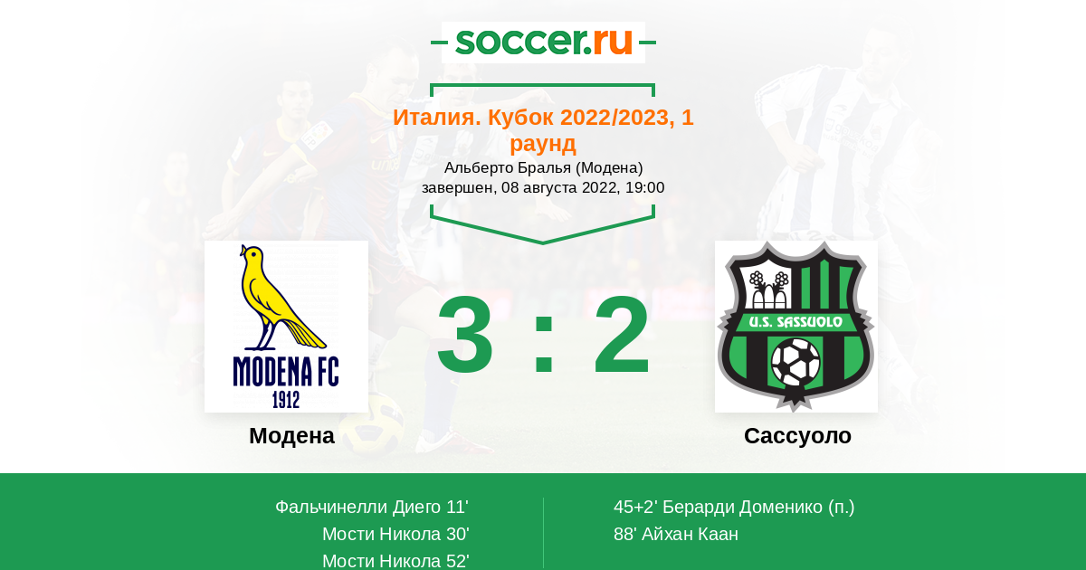 Запасные: 16 Джерли Фабио (с 69'), 15 Сильвестри Томмазо (с 83'), 21 Армеллино Марко (с 83'), 18 Минессо Маттиа (с 89'), 28 де Майо Себастьян (с 89'), 1 Антонио Нарчизо, 77 Пьячентини Маттео, 7 Дука Эдоардо, 3 Понси Фабио, 33 Рензетти Франческо, 70 Абиусо Фабио, 23 Баттистелла Томас, 19 Джованни Ромеро