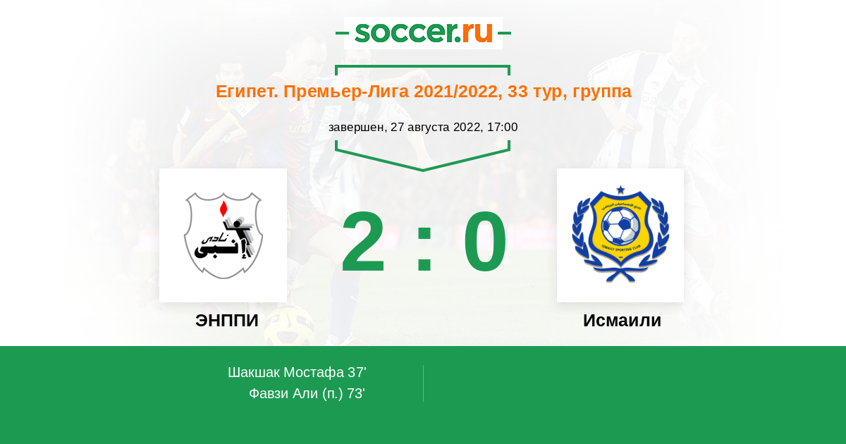 37' (1:0) Шакшак Мостафа (32) (Эль Агуз Ахмед (22))