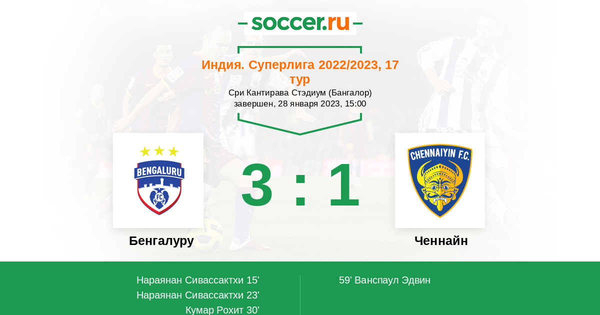 15' (1:0) Нараянан Сивассактхи (39) (Кришна Рой (22))