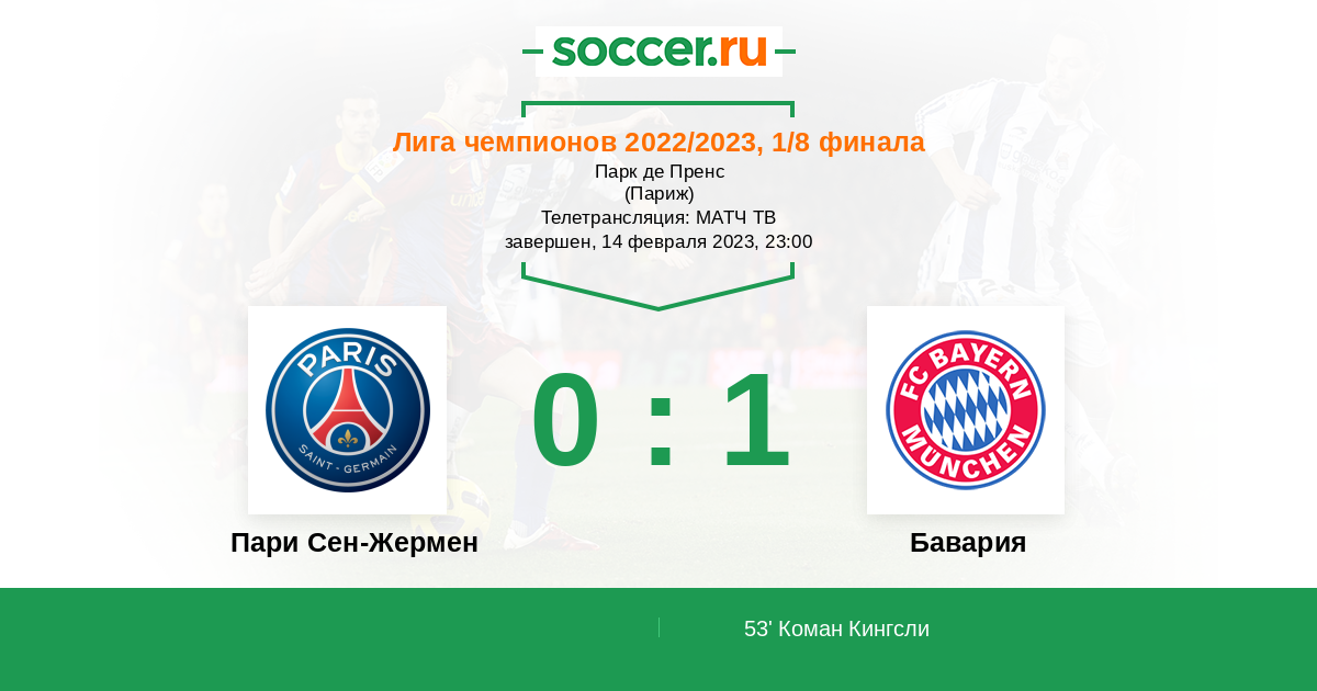 Смотрели всё при памяти, Коман щёчкой продырявил, Киллиан тоже по левому пару тройку накрутил, а вот с замены Мюллер бил фиг куда... Перекладина за ПСЖ.
