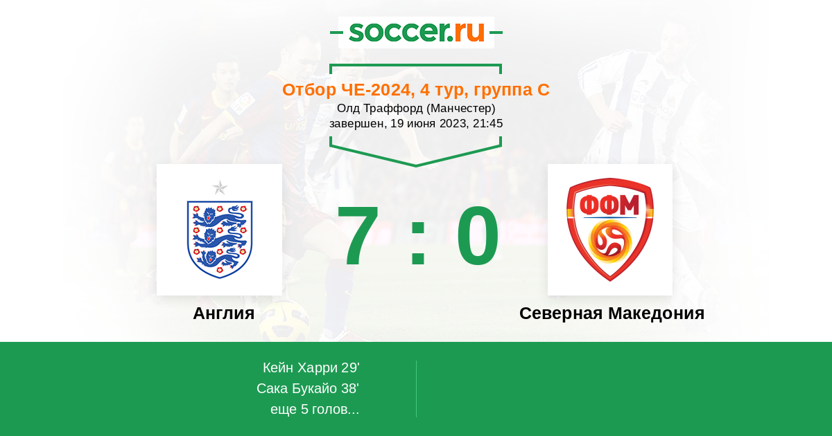 Запасные: 19 Галлахер Конор (с 58'), 17 Грилиш Джек (с 58'), 15 Филлипс Кэлвин (с 59'), 20 Фоден Фил (с 59'), 23 Уилсон Каллум (с 74'), 22 Джонстон Сэм, 21 Эзе Эберечи, 14 Гуэхи Марк, 18 Мэддисон Джеймс, 12 Триппьер Киран, 13 Рамсдейл Аарон, 16 Мингс Тайрон