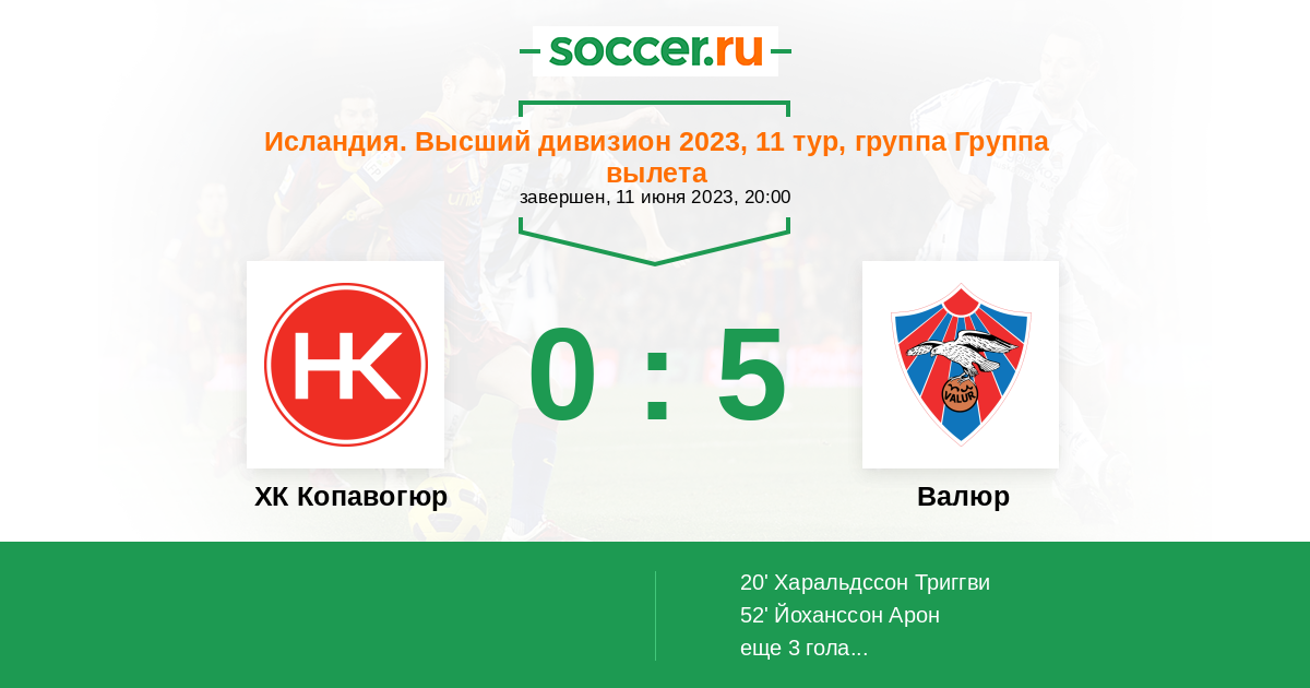 20' (0:1) Харальдссон Триггви (12) (Йоханссон Арон (22))