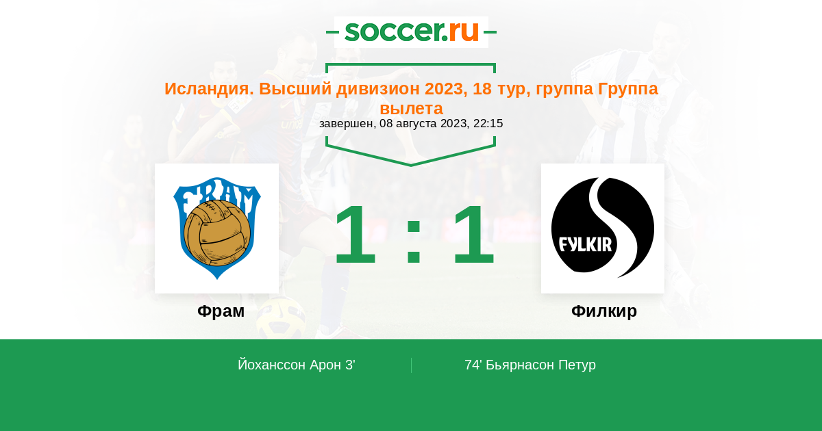 74' (1:1) Бьярнасон Петур (9) (Финсен Олафур Карл (80))
