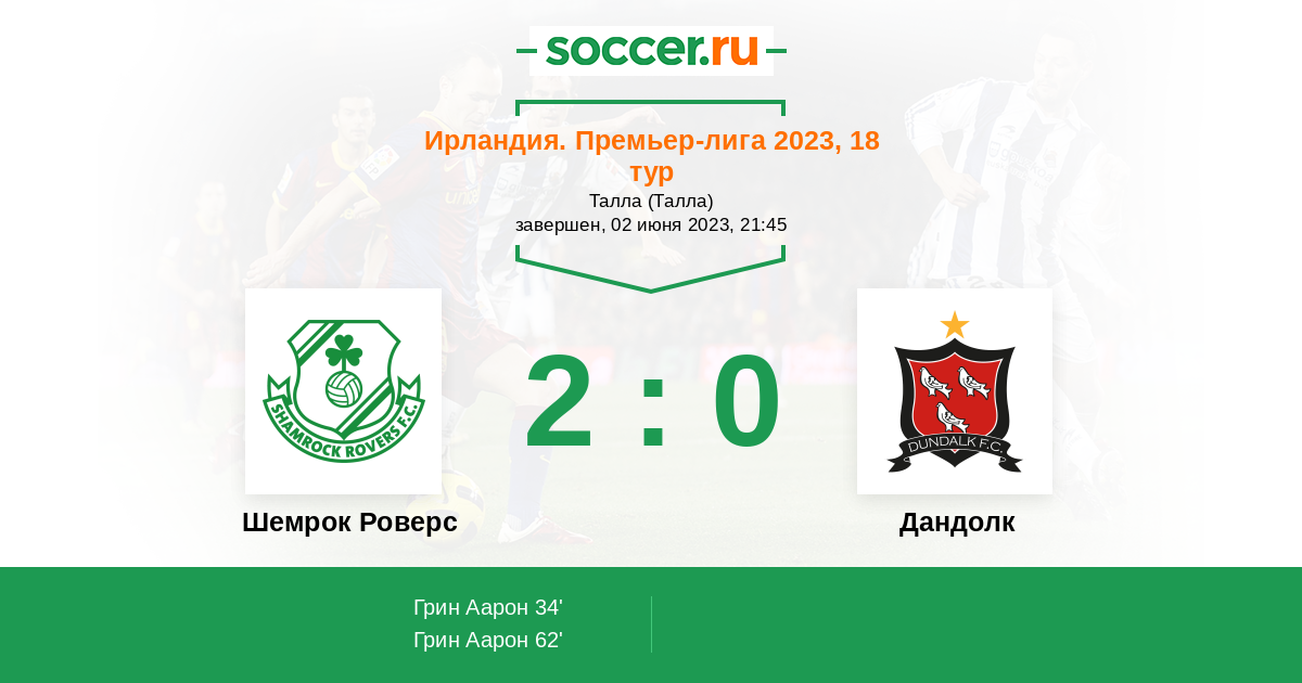 62' (2:0) Грин Аарон (9) (Гаффни Рори (20))