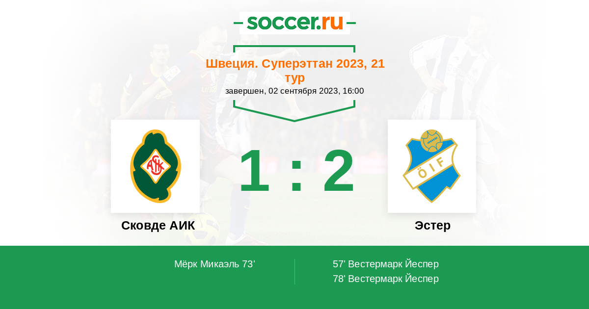 78' (1:2) Вестермарк Йеспер (10) (Люнг Даниэль (18))