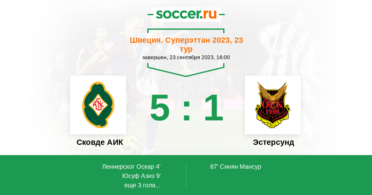 4' (1:0) Леннерског Оскар (8) (Юсуф Азиз)