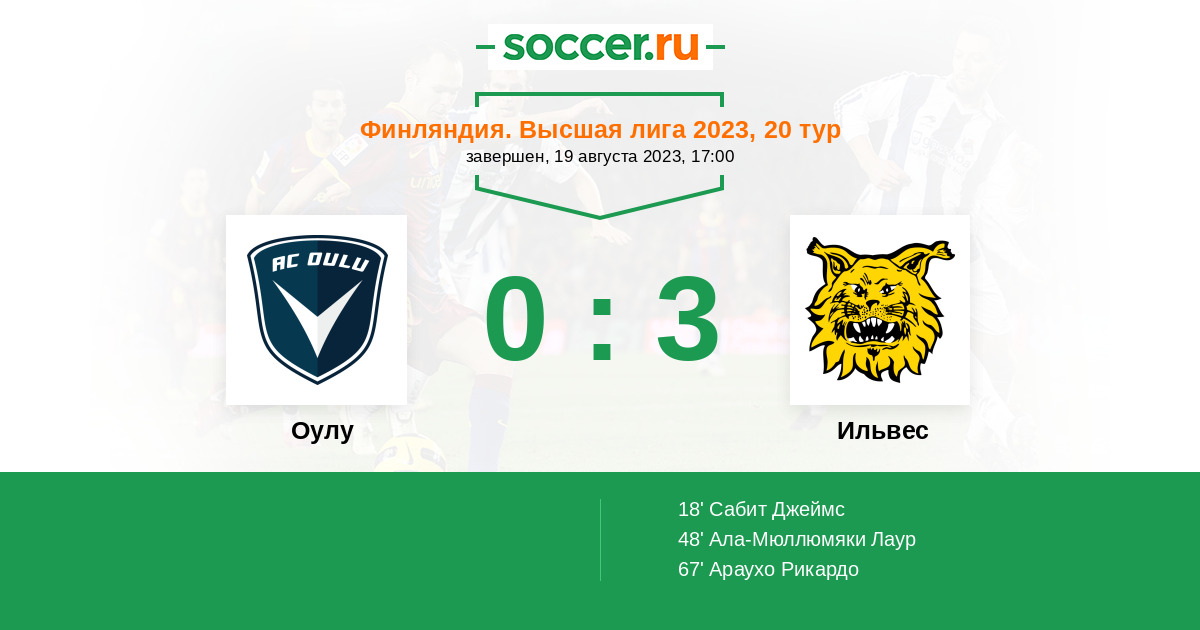 18' (0:1) Сабит Джеймс (7) (Юккола Оива (19))