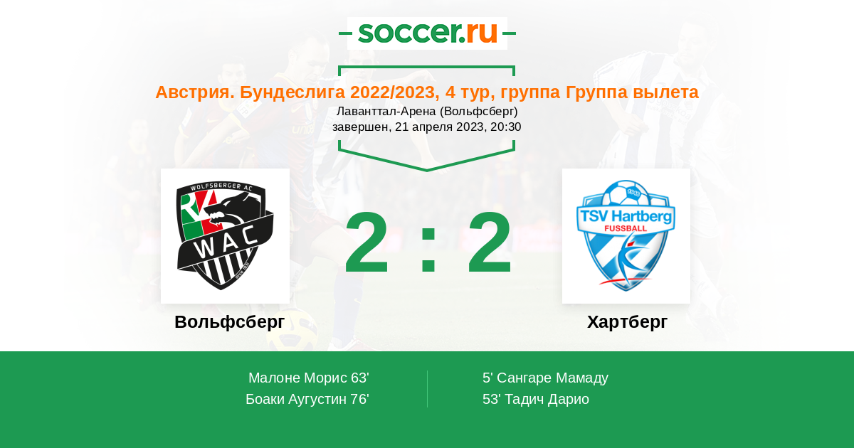 76' (2:2) Боаки Аугустин (20) (Малоне Морис (77))