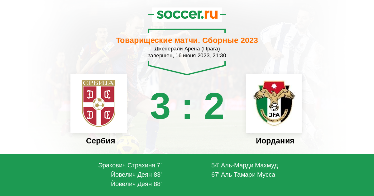 Запасные: 10 Тадич Душан (с 46'), 9 Йовелич Деян (с 46'), 3 Младенович Филип (с 46'), 20 Милинкович-Савич Сергей (с 63'), 7 Илич Иван (с 63'), 14 Живкович Андрия (с 74'), 6 Максимович Неманья, 2 Павлович Страхинья, 12 Петрович Джордже, 23 Илич Велько, 8 Чумич Никола