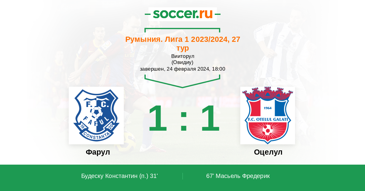 67' (1:1) Масьель Фредерик (67) (Поп Александру (11))