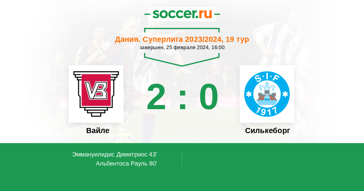 Запасные: 25 Лауритсен Тобиас (с 65'), 38 Чолина Давид (с 65'), 18 Якобсен Андерс (с 65'), 15 Офори Эбезенер (с 89'), 19 Линд Виктор, 59 Элвиус Мариус, 11 Джувара Муса, 22 Сондерсков Андерс, 31 Векич Игор