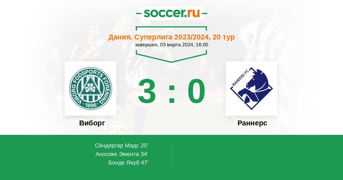 20' (1:0) Сёндергар Мадс (6) (Кристенсен Оливер (23))