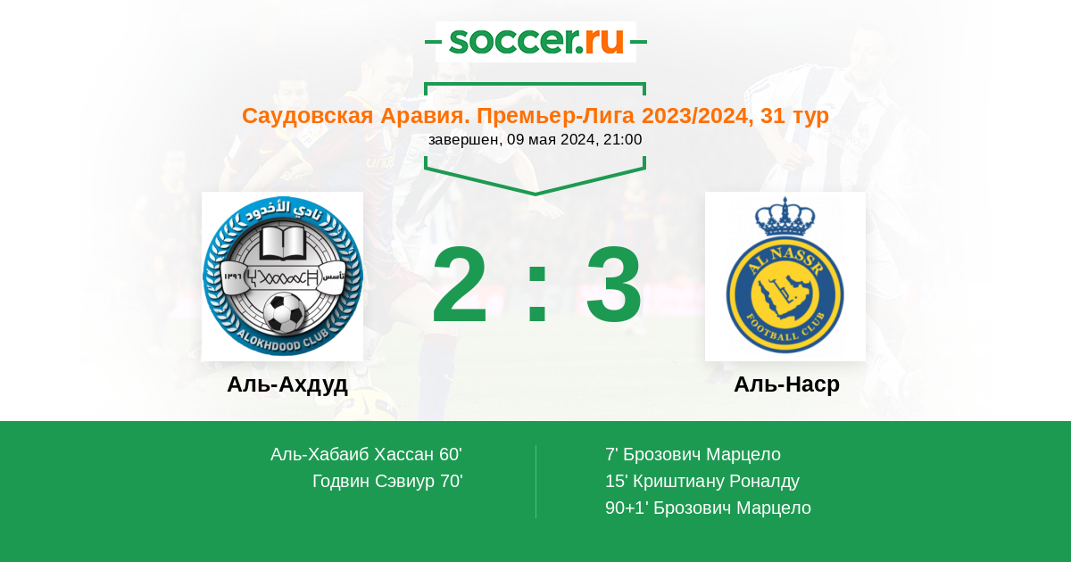 15' (0:2) Криштиану Роналду (7) (Аль-Хассан Али (19))