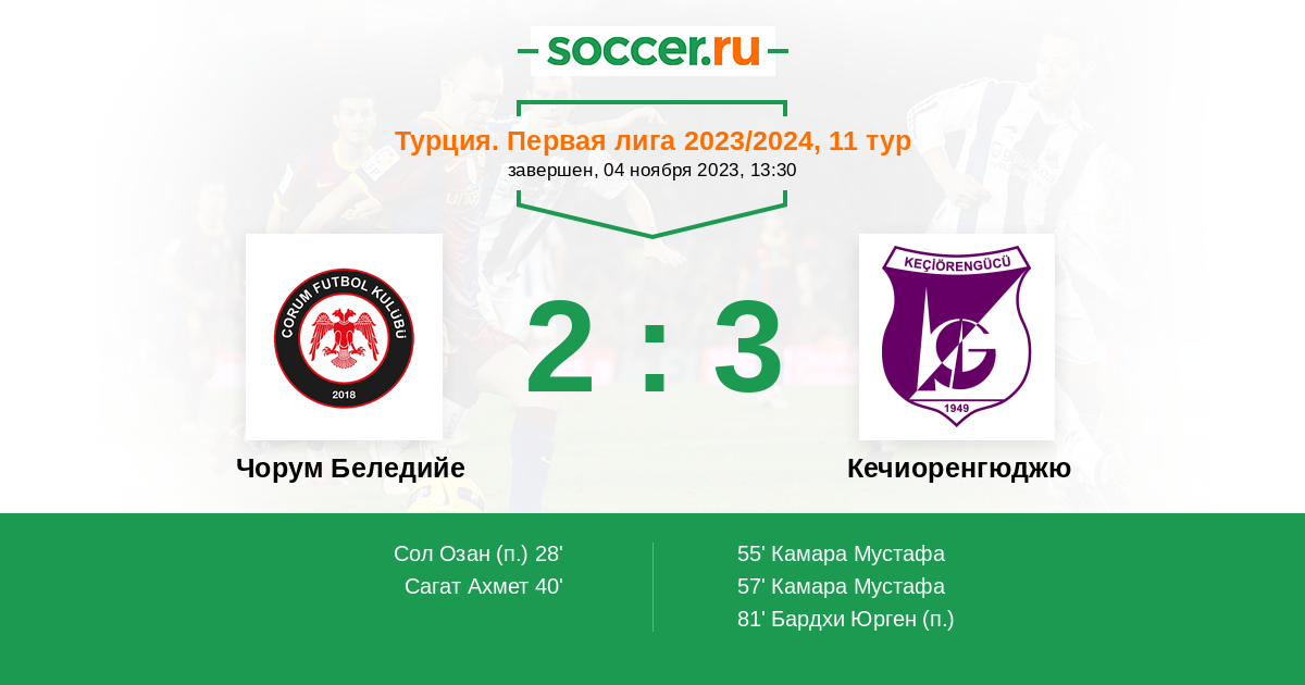 55' (2:1) Камара Мустафа (14) (Акташ Муса (23))