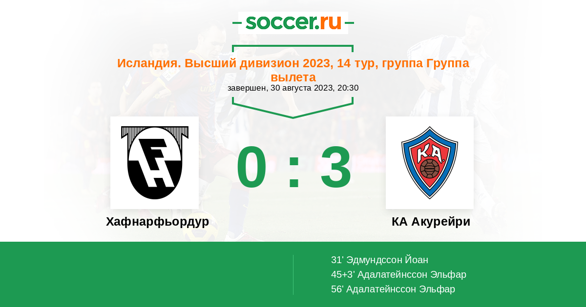 31' (0:1) Эдмундссон Йоан (16) (Сигургейрссон Асгейр (11))