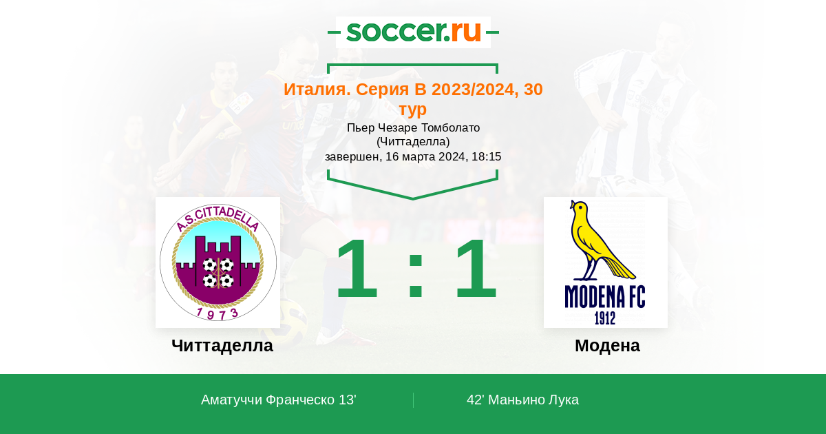 42' (1:1) Маньино Лука (6) (Коррадо Никколо (91))