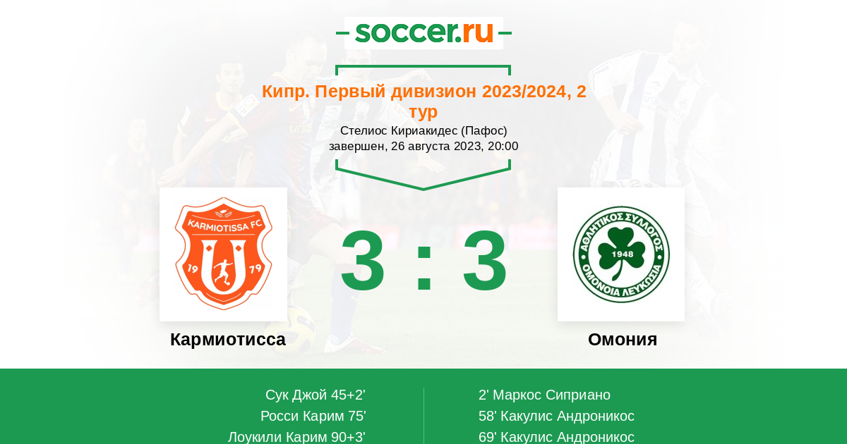 Запасные: 8 Кассама Морету (с 46'), 9 Какулис Андроникос (с 46'), 17 Лецякс Ян (с 67'), 10 Лойзу Лойзос (с 67'), 31 Иоаннис Кусулос (с 79'), 1 Панайи Костас, 23 Узохо Фрэнсис, 22 Ланг Адам, 87 Пантели Константинос, 74 Андреу Панайотис, 86 Христу Андреас, 20 Захариу Панайотис