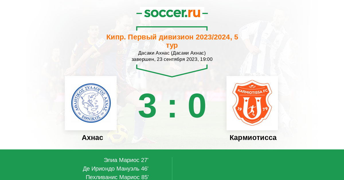 Запасные: 22 Иоанну Петрос (с 45'), 7 Элиа Константинос (с 59'), 8 Липски Патрик (с 59'), 9 Гомеш Жозе (с 59'), 10 Пехливанис Мариос (с 77'), 11 Брадоньич Владимир, 16 Бейкер Лукас, 20 Калленос Стилианос, 26 Маркович Душан, 33 Ставрину Андреас, 93 Аксентьевич Никола