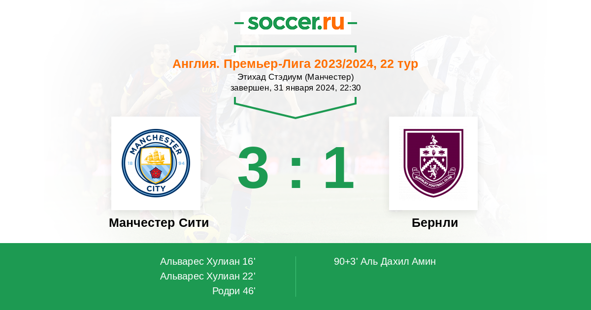 22' (2:0) Альварес Хулиан (19) (Де Брюйне Кевин (17))
