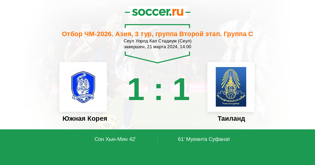 Запасные: 10 Муеанта Суфанат (с 58'), 21 Бурират Суфахан (с 83'), 6 Йуйен Сарач (с 90+1'), 20 Ануин Саранон, 4 Дола Элиас, 15 Анан Покхао, 19 Арджвираи Порамет, 2 Чаннгом Сантифарп, 23 Вонгсаджаем Бунякаит, 11 Пхала Бордин, 14 Пумчантуек Рунгратх, 5 Каман Критсада