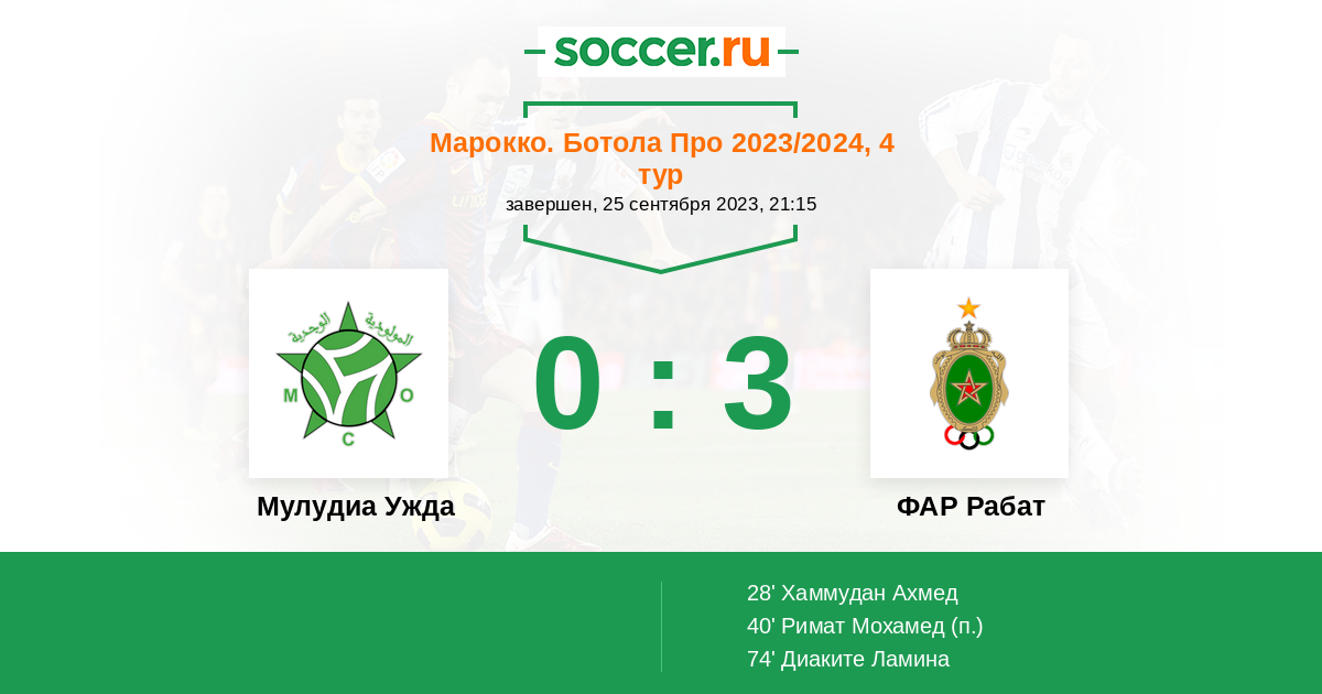 Запасные: 27 Диаките Ламина (с 59'), 19 Тархатт Ануар (с 68'), 20 Арбиди Юссеф (с 68'), 14 Ажарай Алаэдин (с 68'), 8 Аит Уаркхан Халид (с 77'), 1 Эль Хаяти Аюб, 29 Моуфид Мохамед, 10 Зух Зух Амин, 28 Уро-Агоро Исмаиль