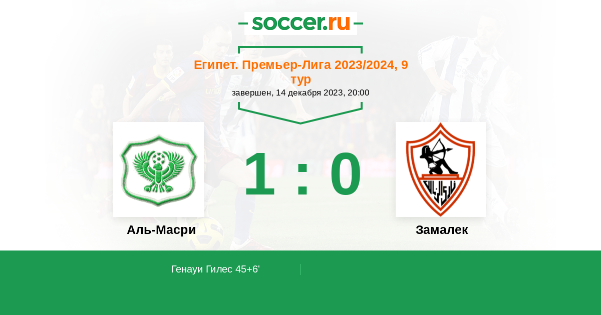 Запасные: 27 Хассан Мохамед (с 37'), 7 Ндиайе Ибрахима (с 46'), 19 Эль Манси Насер (с 63'), 15 Амр Эль Сиси (с 63'), 10 Разек Махмуд Абдель (с 79'), 40 Рефаи Ахмед, 22 Гомаа Абдулла, 34 Нафад Абдель Рахман, 9 Акиньюла Самсон