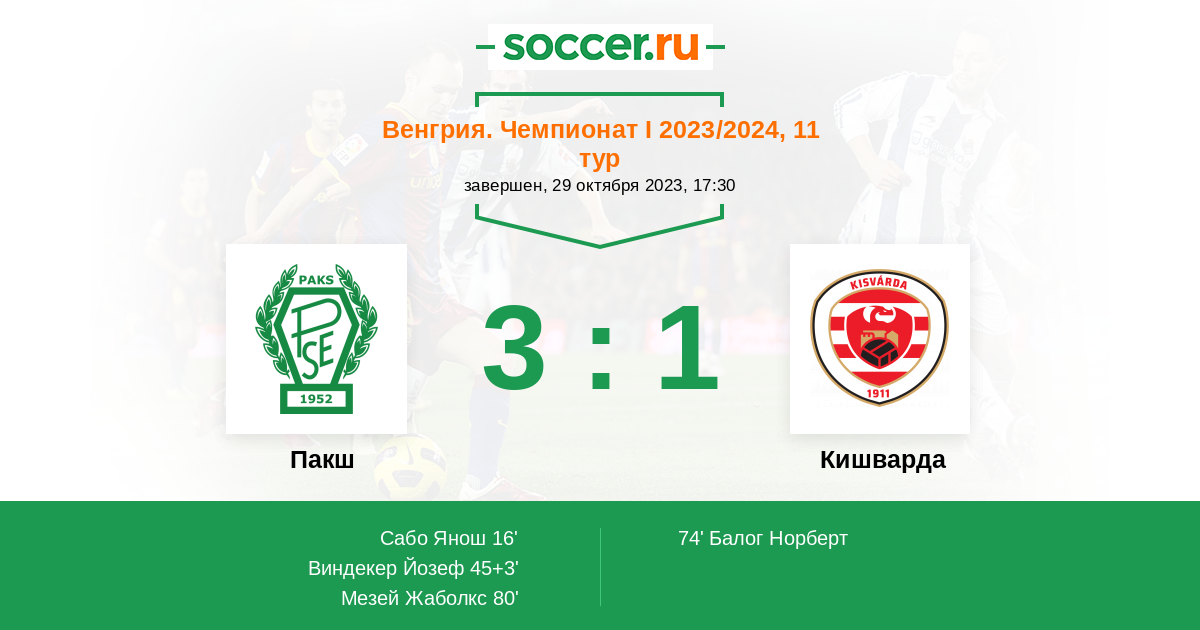 16' (1:0) Сабо Янош (30) (Леншер Бенс (24))