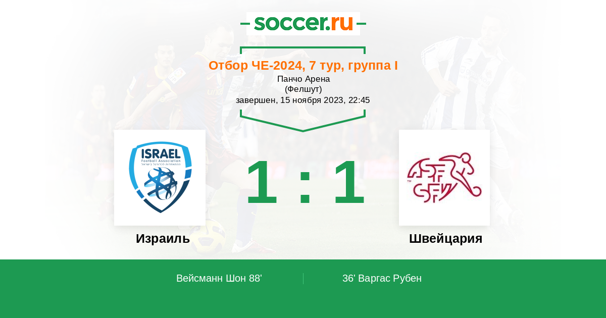 Израилю придется играть на нейтральном поле, что лишает его фактора домашних трибун и прочих преимуществ домашней игры. А класс швейцарцев однозначно выше сейчас. Игру Швейцарии определяет мощная полузащита с Джакой, Фройлером, Амдуни и Шакири. Плюс сейчас весьма неплохо выглядят и игроки обороны в своих клубных командах - вратарь Зоммер, центральный защитник Аканджи. Максимум, на что может рассчитывать Израиль это ничья, да и то при благосклонности Фортуны.