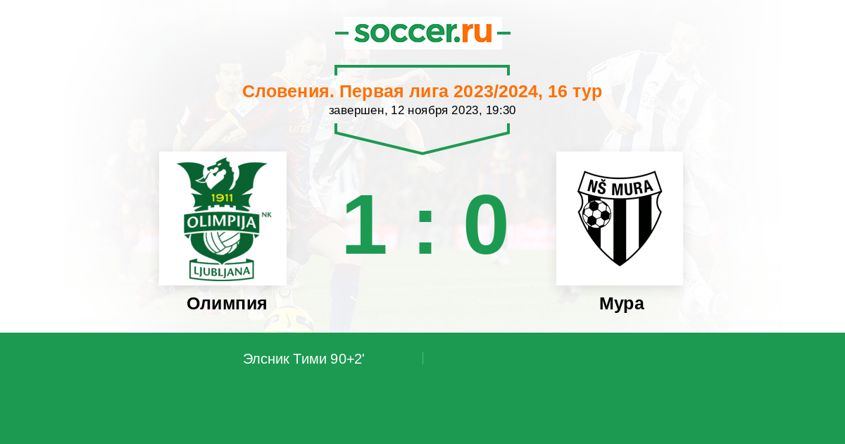 90+2' (1:0) Элсник Тими (10)