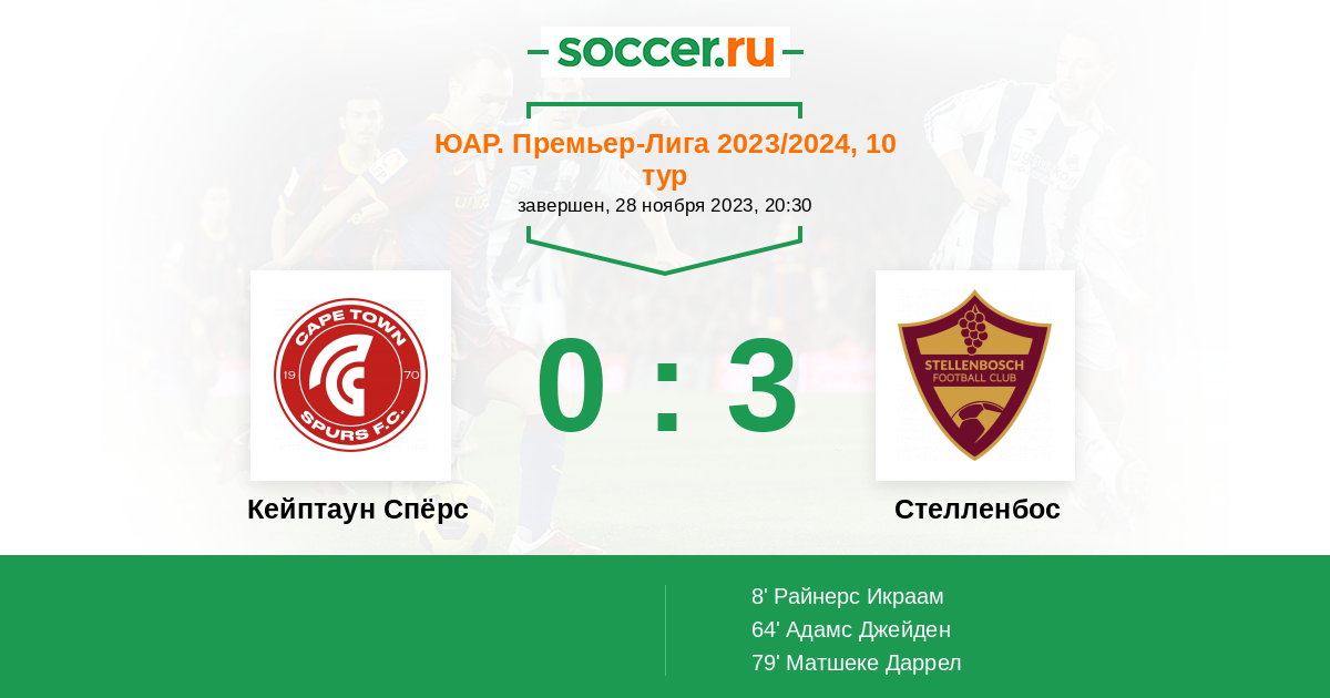 Запасные: 15 Хауконго Лубени (с 46'), 9 Ралани Брэдли (с 46'), 22 Мооса Терло (с 61'), 34 Берн Лиам (с 68'), 10 Буханан Киган (с 90+2'), 43 Босхофф Нейл, 17 Велебайи Асенеле, 4 Дэниелс Клейтон