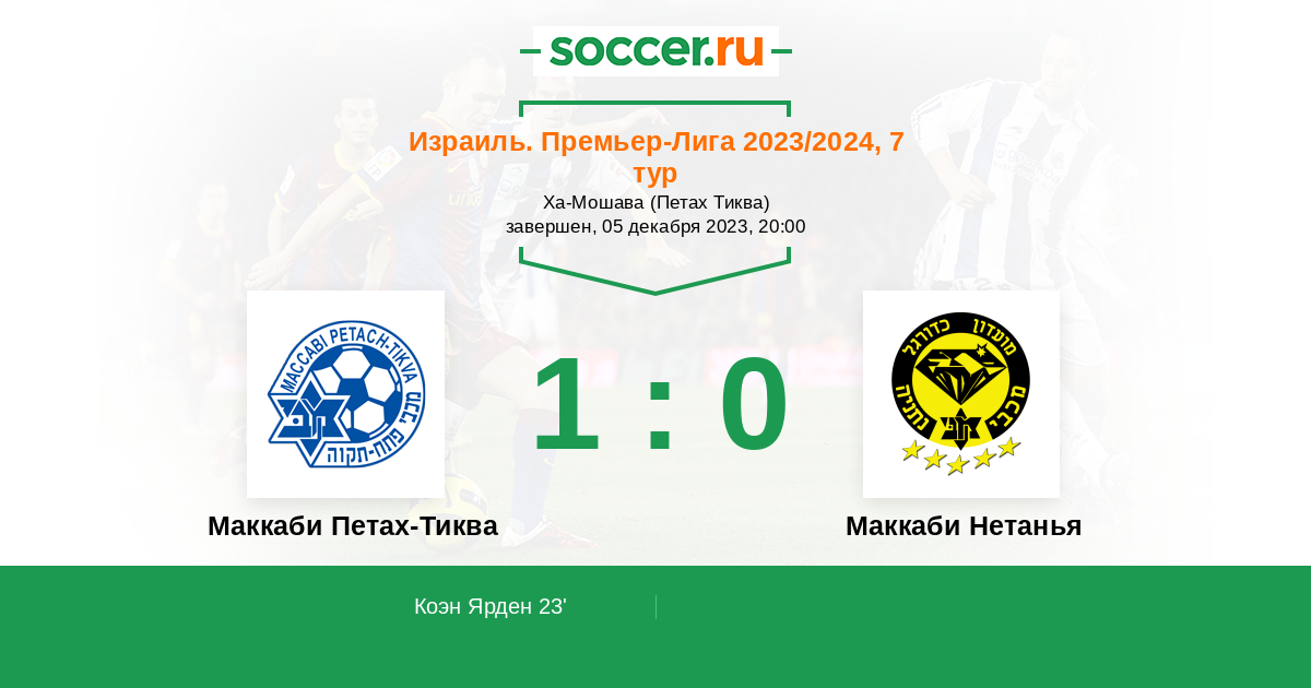 23' (1:0) Коэн Ярден (16) (Жабар Ибрахим (19))