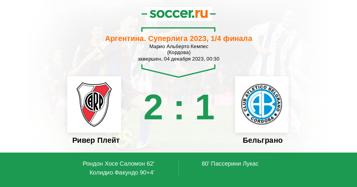 Запасные: 22 Краневиттер Матиас (с 46'), 36 Солари Пабло (с 67'), 3 Фунес Мори Рамиро (с 78'), 16 Колидио Факундо (с 78'), 18 Мартинес Гонсало (с 90+1'), 2 Боселли Хуан, 15 Эррера Марсело, 8 Палавесино Агустин, 33 Сентурион Эсекиль, 10 Лансини Мануэль, 7 Суарес Матиас, 6 Мартинес Эктор