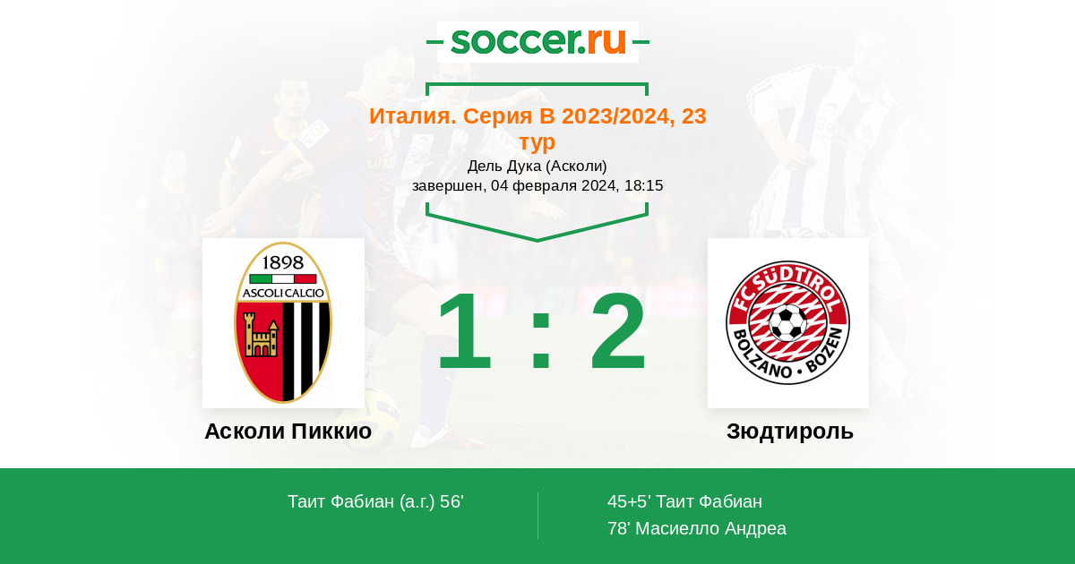 45+5' (0:1) Таит Фабиан (21) (Симоне Дави (24))
