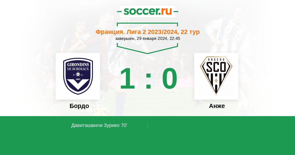 70' (1:0) Давиташвили Зурико (30) (Ливолан Жереми (7))
